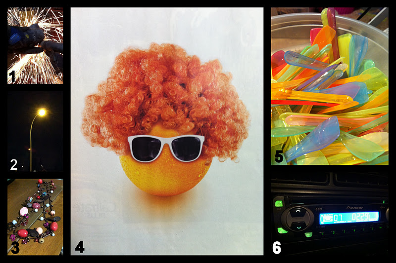 1. teeny tiny molten pieces of metal exploding from the pipe my dad was slicing through...made me smile mostly because he asked if I wanted to do it and I screamed in surprise at the first spray of bright sparks. Also, because it looks like a shower of thousands of shooting stars.
